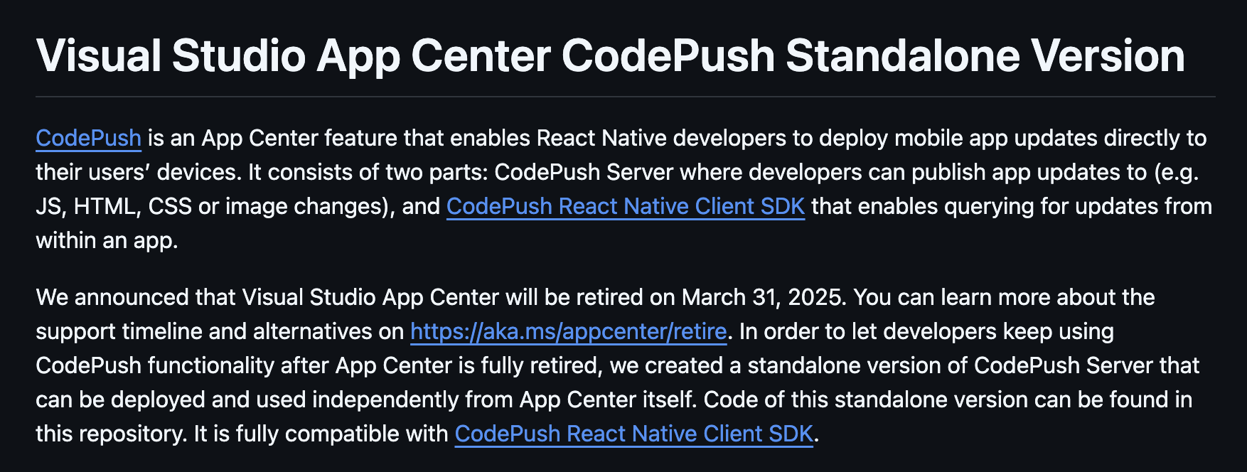 처음엔 막연히 CodePush가 종료된다! 이렇게 알고 있었는데 정확하게는 App Center 자체가 서비스를 종료하기 때문에 CodePush를 위한 App Center의 인프라와 서비스도 자연스럽게 종료된다고 볼 수 있다.