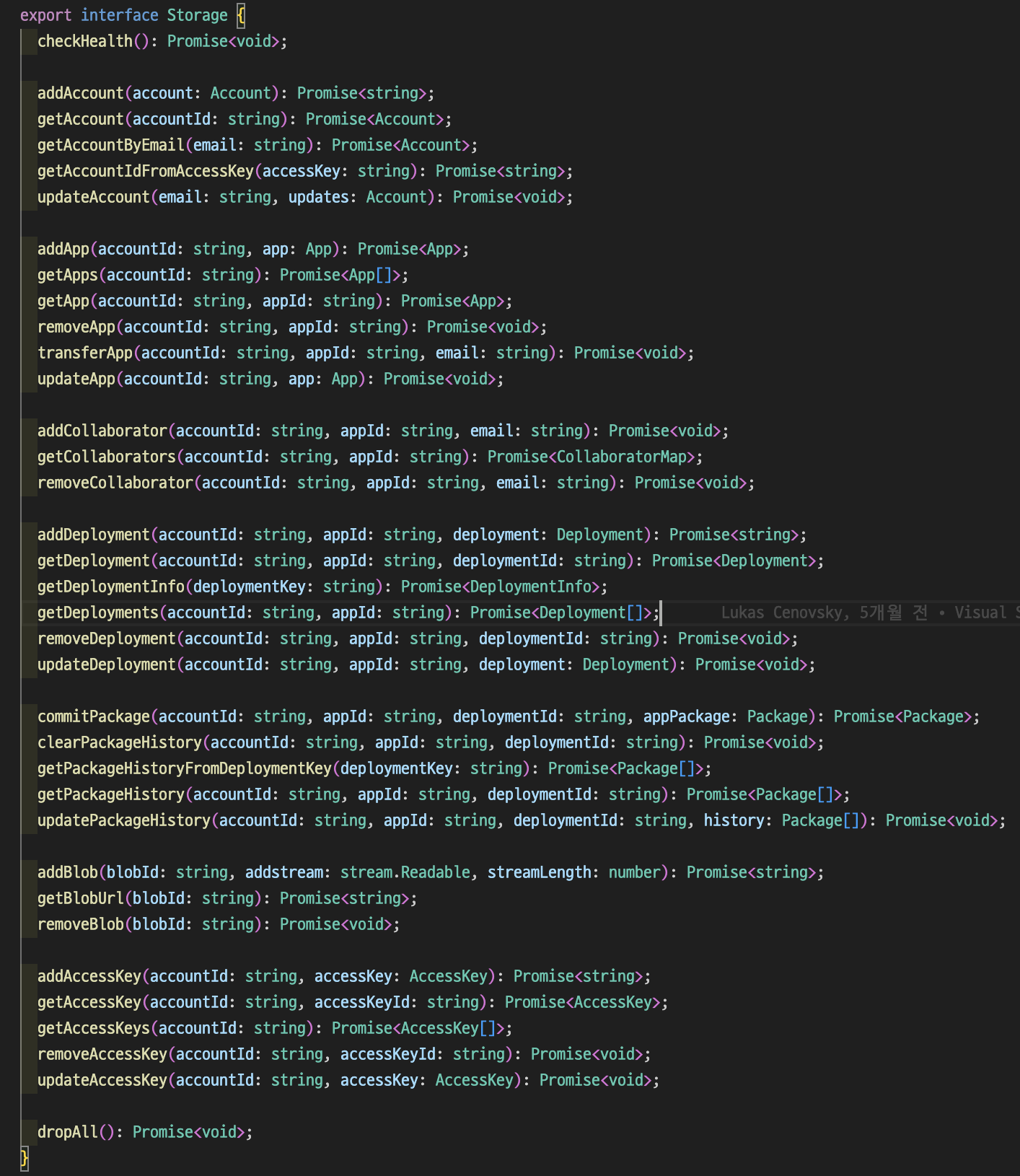 아래의 이미지는 code-push-server의 storage interface인데 계정, 앱, 구성원, 배포 환경, 패키지, Blob, 엑세스 키를 관리하는 완전한 저장소 시스템의 구현을 위한 인터페이스라고 볼 수 있다.