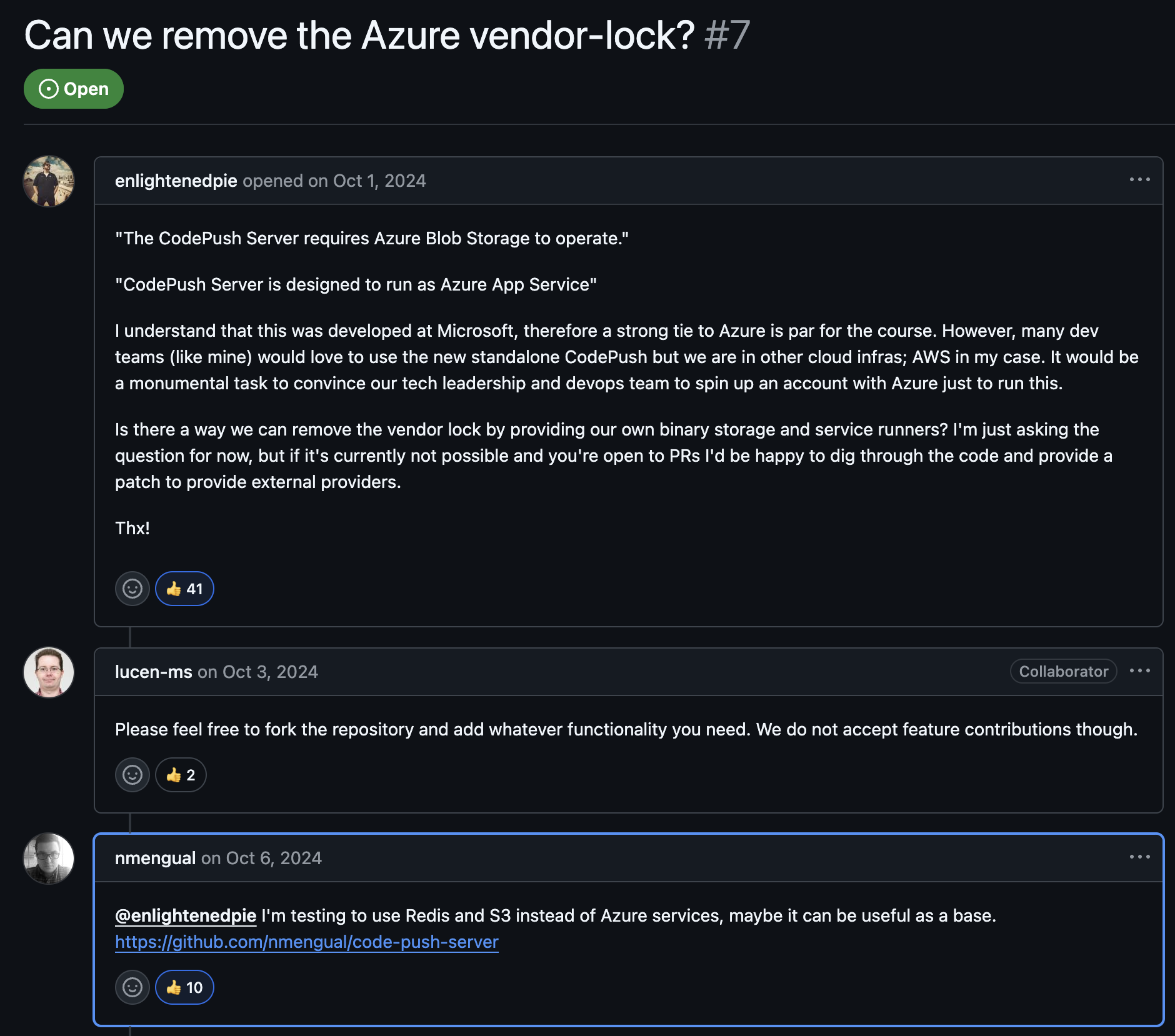 그리고 MS에서 제공하는 저장소를 포크뜬 것 중에 가장 많은 star를 받은 저장소이다. 제공된 인터페이스를 AWS S3와 Redis 기반으로 구현한 코드이다. vendor lock을 풀어달라는 issue에 본인이 만든 걸 베이스로 유용할 것이다라고 직접 홍보를 하더라.