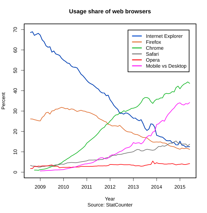 파이어폭스는 꾸준히 점유율을 높여갔지만 IE에 익숙해진 사용자들에게 큰 영향을 미치기는 어려웠고 MS 또한 아웃룩과의 연계, 표준화 거부 등을 통해서 IE의 점유율을 유지하고자 했다.