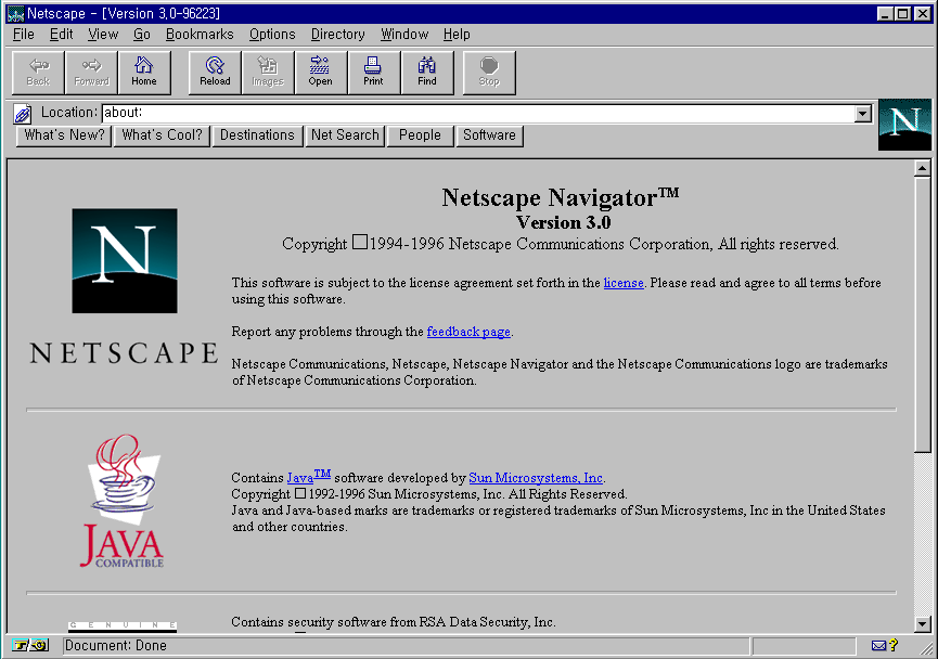 초기 IE의 기능은 빈약했고 이미 시장은 넷스케이프 네비게이터의 독점체제였다. 그리고 이 자리를 굳건히 하기 위해 브라우저에 경량의 프로그래밍 언어를 임베디드하여 인터랙티브한 HTML을 제공하기로 결정하여 브랜든 아이크를 영입했다. 브랜든 아이크는 단 열흘 만에(...) 자바스크립트를 개발했고 넷스케이프 네비게이터 2.0는 자바스크립트가 내장되어 출시되었다. 그러나 IE는 MS의 전폭적인 지원을 받으며 성장했고 넷스케이프 네비게이터에 비해 특별하게 기술적인 강점이 존재하진 않았지만 MS의 마케팅 전략이 빛을 발하며 시장 점유율을 조금씩 차지하기 시작한다.